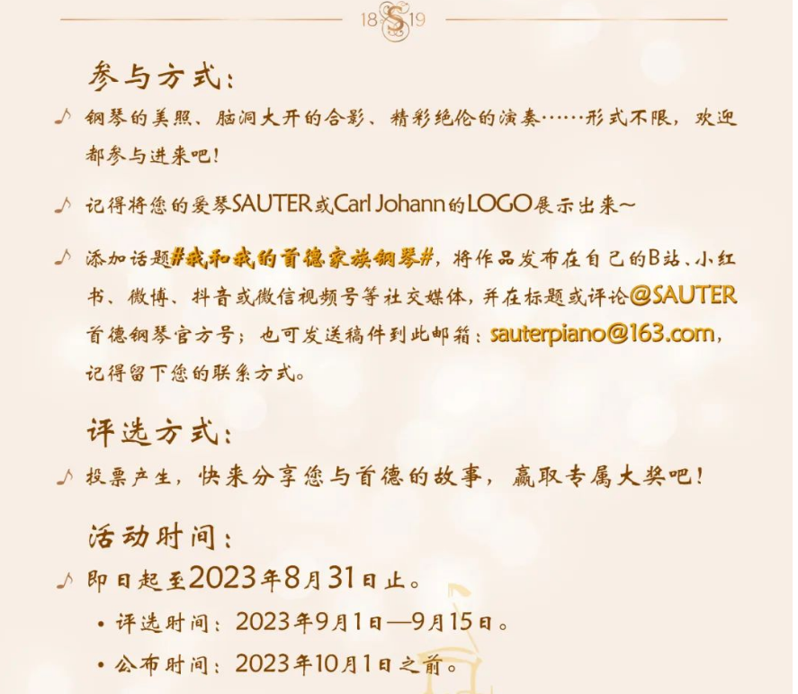 ④添加話題 #我和我的首德家族鋼琴# 發(fā)表在您的個人社媒頻道,并在標(biāo)題或評論@首德鋼琴官方號;或也可發(fā)送稿件到此郵箱:sauterpiano@163.com,記得留下您的聯(lián)系方式。